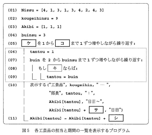 行番号(01)は「工芸品1から9までの製作にかかる日数を配列で示したもの」、行番号(02)は「工芸品の総数は9つであること」、行番号(03)は「各部員の空き日を示す配列で、初日においてはいずれの部員も空き日であることから全員に1が設定されていること」、行番号(04)で「その部員数が3名であること」が全て文章で記述され、同時にプログラム表記されているのです。