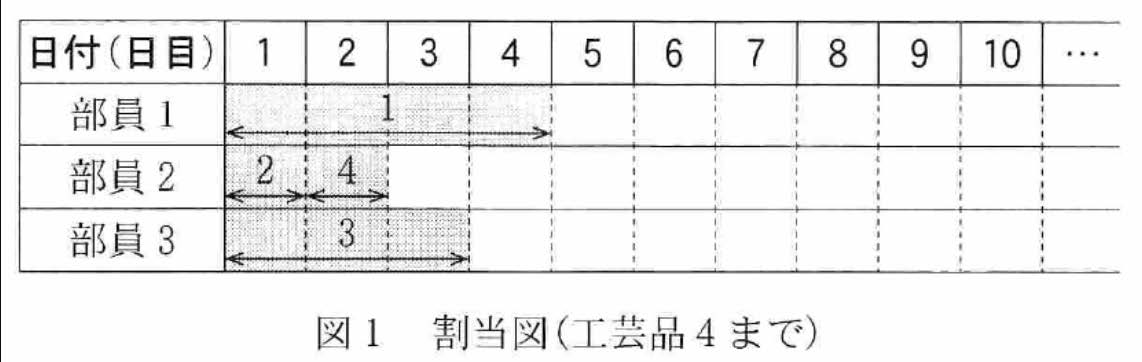 そして行番号(11)は部員1の空き日の更新を行うプログラムです。部員1が工芸品1を4日かけて製作しますから新たな空き日は5日目となります。Akibi[tantou]を更新するには最初の空き日に工芸品1の製作日数を加えれば良いことが分かります。ですので空欄シは、Nissu[kougeihin]となるのです。