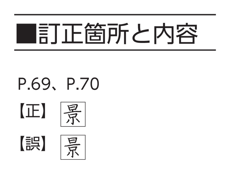 商品名: くもんの暮らしに書写 1日1枚で手書き文字がかわる くもんの書写ドリル 投稿日 2025/11/13 著者 くもん出版 誤植カテゴリー その他のカテゴリー 下記の商品において内容の一部に誤りがあることが判明いたしました。深くお詫び申し上げますとともに訂正させていただきます。 印刷用 PDF はこちらから ダウンロード ※5画目の縦画の欠落 商品情報はこちら