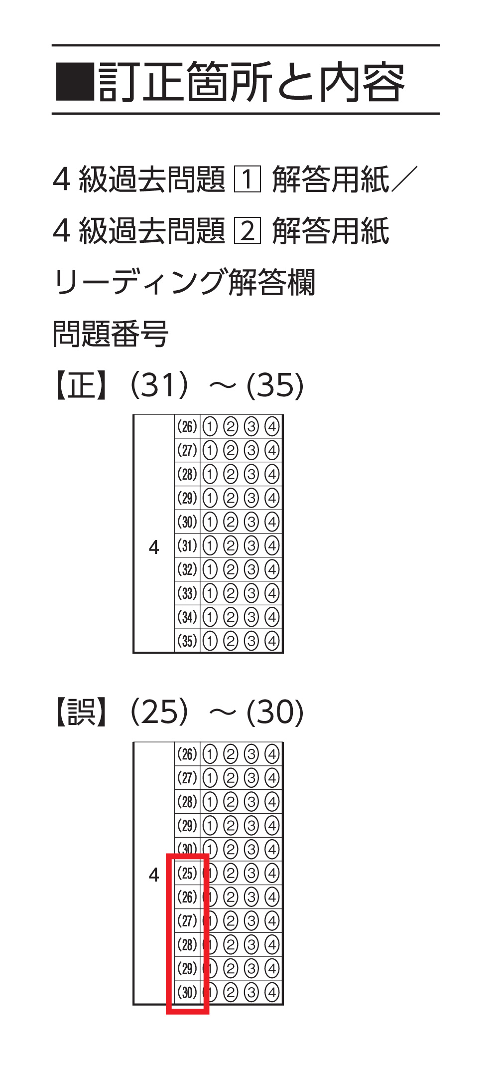 商品名: 小学生からできる くもんの出題形式別英検4級問題集 投稿日 2025/12/23 著者 くもん出版 誤植カテゴリー その他のカテゴリー 下記の商品において内容の一部に誤りがあることが判明いたしました。深くお詫び申し上げますとともに訂正させていただきます。 印刷用 PDF はこちらから ダウンロード 修正した解答用紙はこちらからダウンロードできます。 印刷用 PDF はこちらから ダウンロード 商品情報はこちら