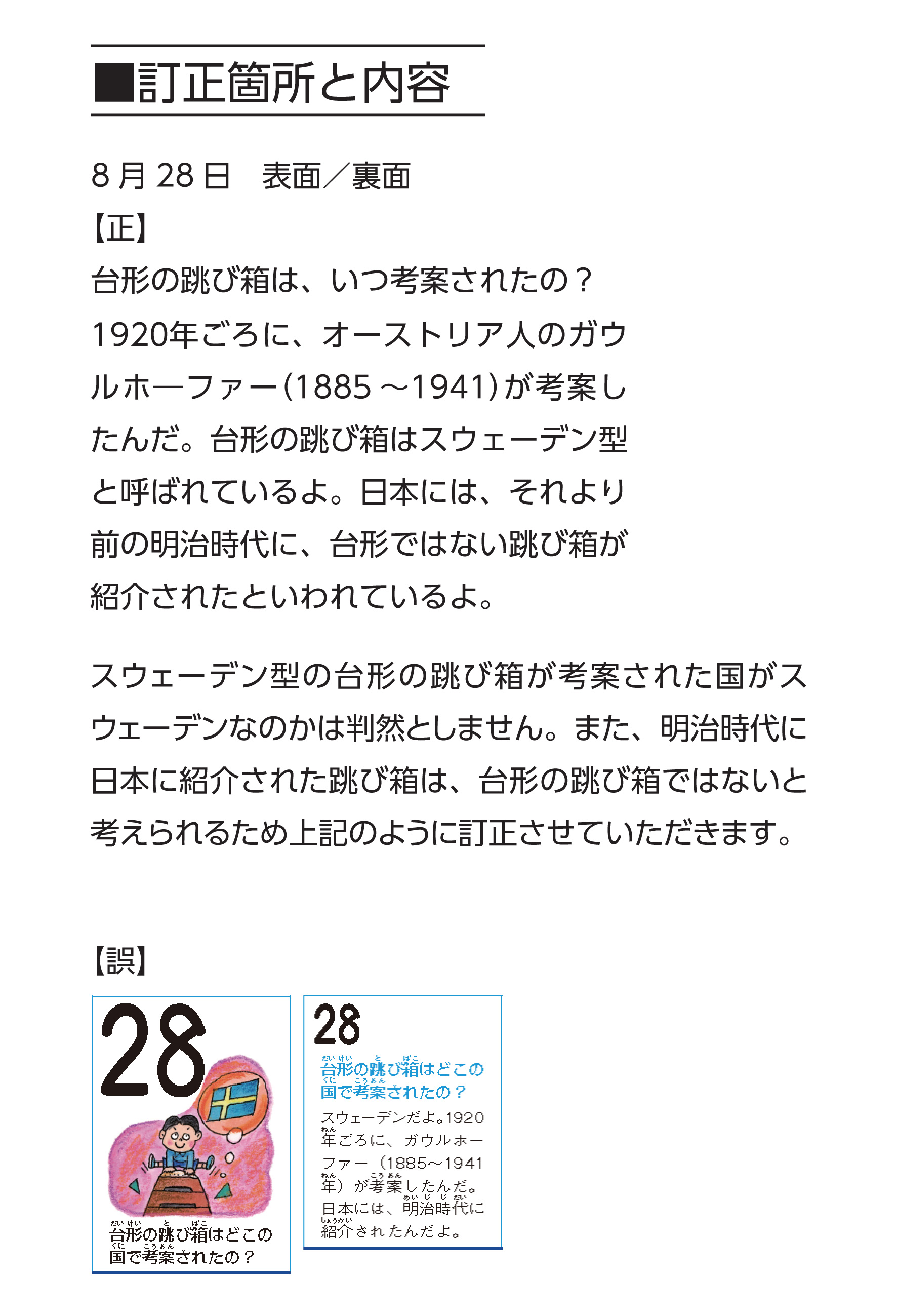 商品名: くもんなぜなぜカレンダー2025年版(通常版・大判) 投稿日 2025/09/16 著者 くもん出版 誤植カテゴリー その他のカテゴリー 下記の商品において内容の一部に誤りがあることが判明いたしました。深くお詫び申し上げますとともに訂正させていただきます。 印刷用 PDF はこちらから ダウンロード 印刷用 PDF はこちらから ダウンロード